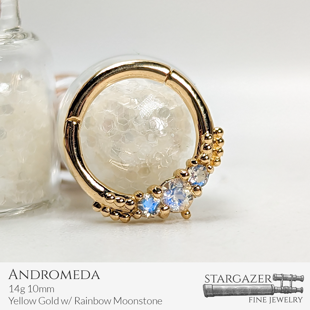 Andromeda - 14g 10mm, Yellow Gold with Rainbow Moonstone