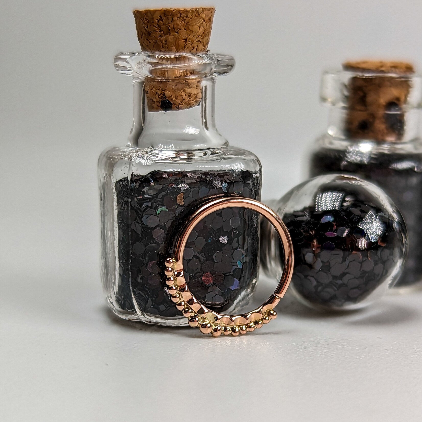 This piece has various sized beads with a crimped detail in Rose gold.