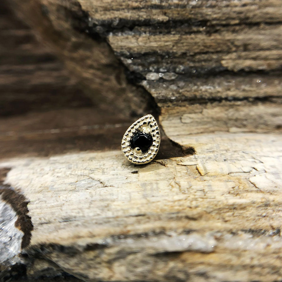 Golden beads in a pear shape surrounding a single 2mm gem.