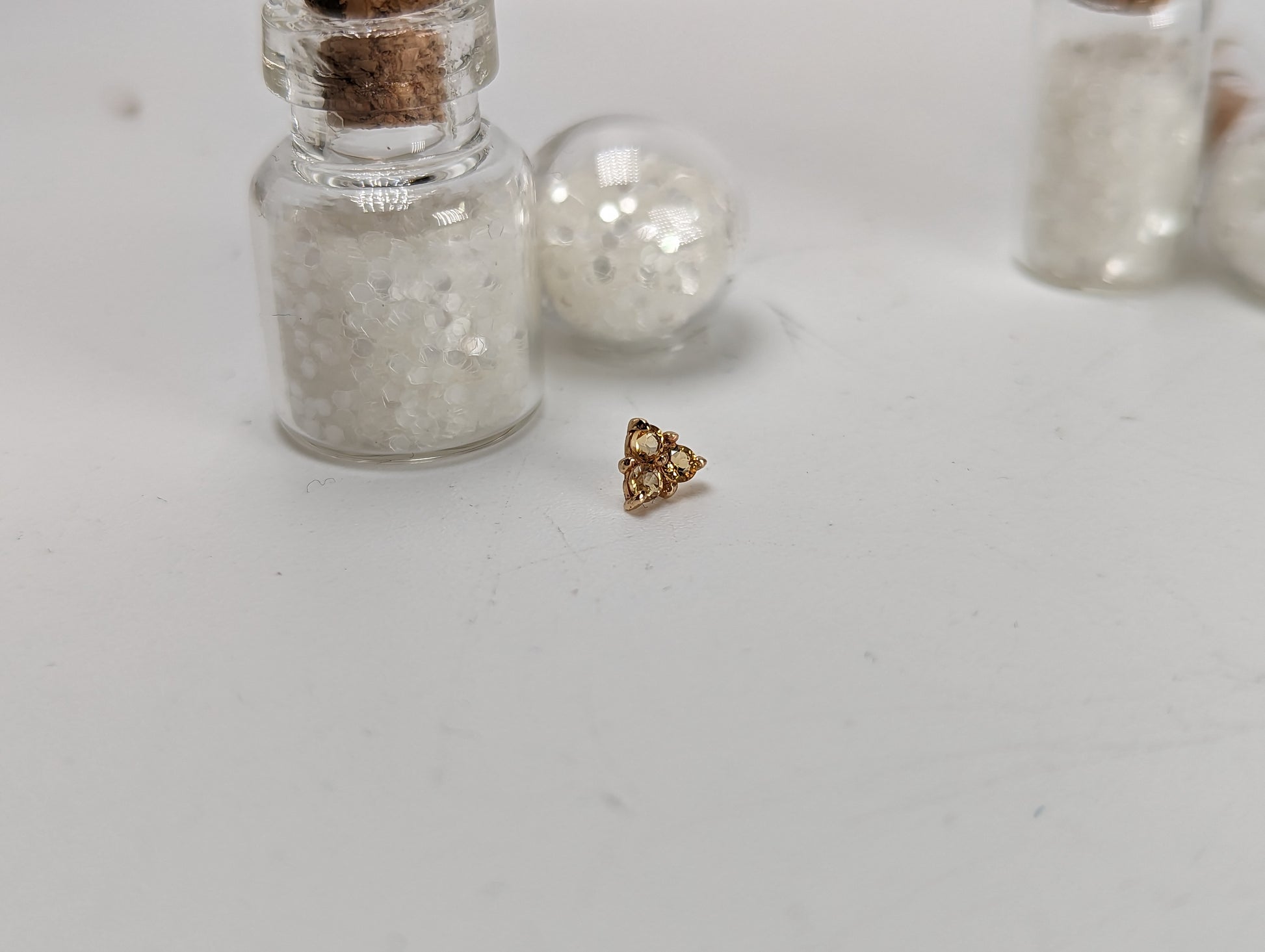 This lovely piece features three 2mm citrine stones in a 14k yellow gold setting. This piece is 14g/12g threaded.