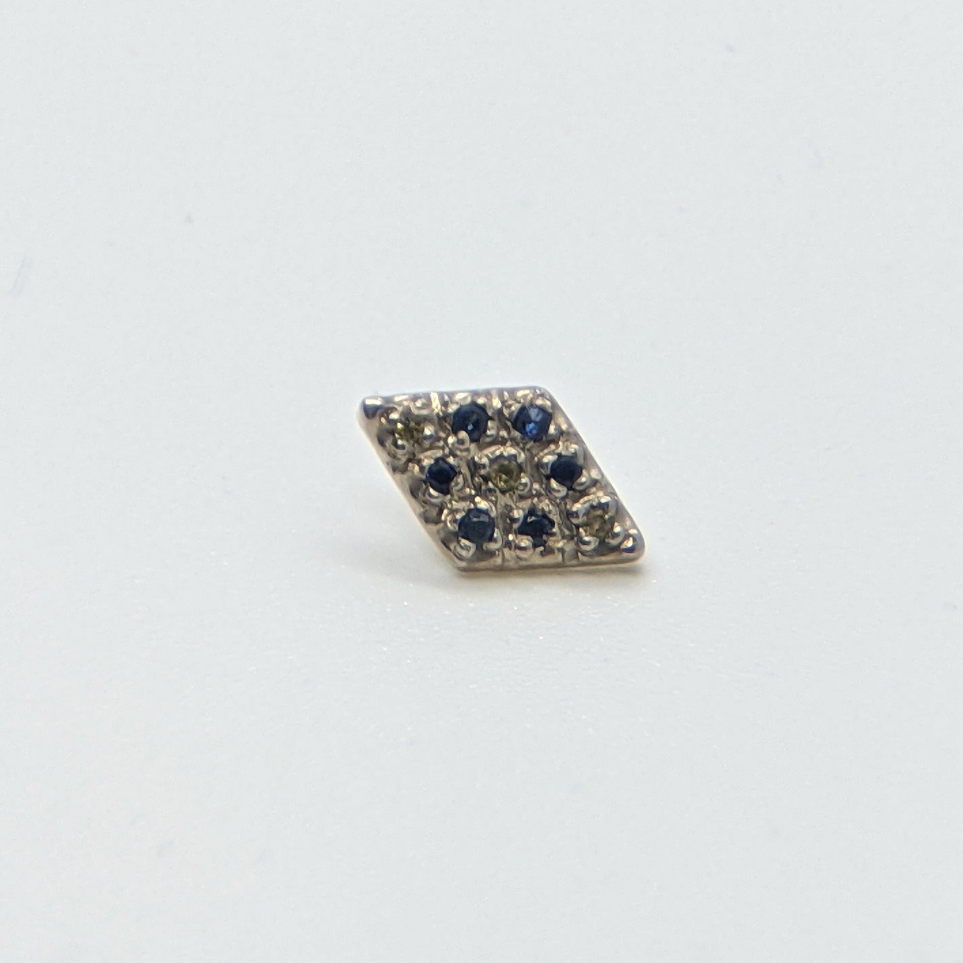 This rhombus shaped 14k palladium white gold end has 14g/12g threading. It features 1mm blue sapphire and peridot stones.