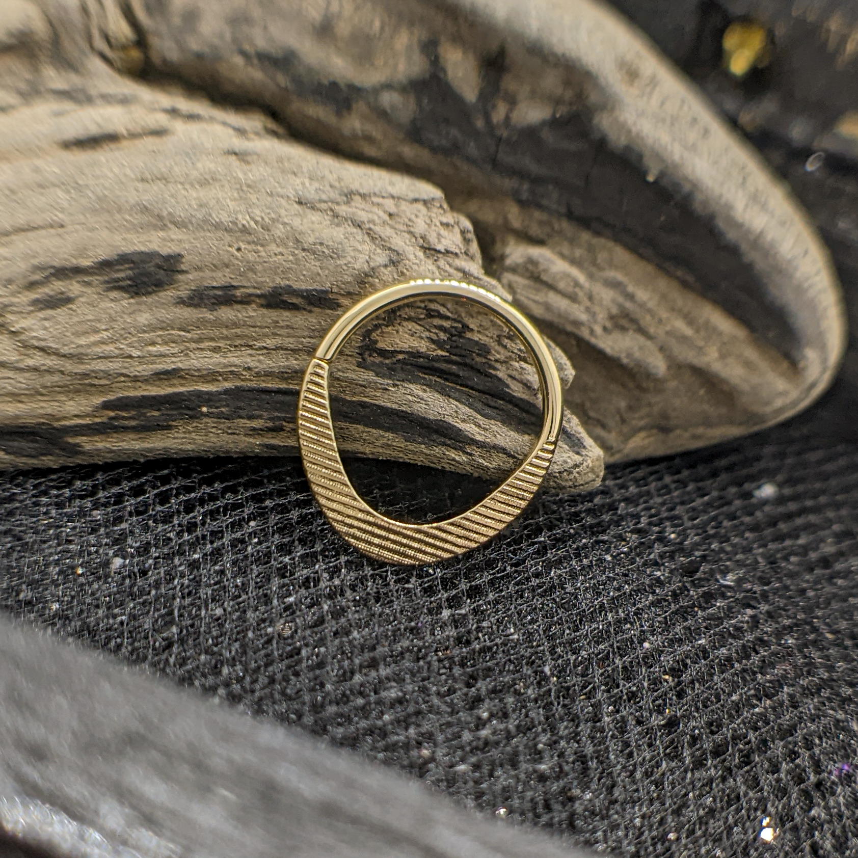 One side of this seamless ring is smooth, while the other has a bold, lined texture to give you two ways to wear this unique piece.